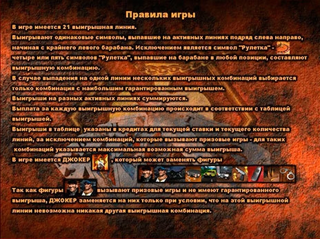 Сюжет и символика автомата сопряжен с криминальным миром и деньгами. Эмулятор имеет 5 барабанов. Призовые цепочки можно посмотреть на красочной пиктограмме игры. Игрок, нажав на соответствующую кнопку с числом, может выбрать количество игровых линий (1—21). Затем установить ставку на линию (1—100 кредитов). Можно сразу выбрать наибольшую ставку клавишей «Максимальная ставка». Но она не запускает барабаны и не меняет численность игровых линий. Все кнопки понятны и просты для любого геймера. Также имеется на слоте кнопка «Помощь», с помощью которой можно узнать таблицу коэффициентов и правила онлайн-игры.