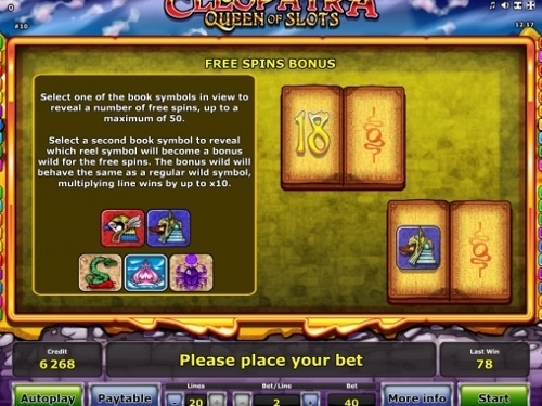 - Ознакомиться с правилами и выплатами видео слота Клеопатра – королева слотов поможет клавиша More info