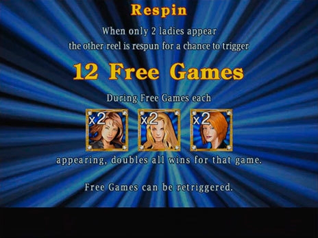 Фри спины запускаются 3 символами разбросами. Красивые девушки предлагают игрокам 12 дополнительных вращений. Если на экране появляются лишь 2 красавицы, то автомат самостоятельно крутит барабаны в поисках третьей девушки.