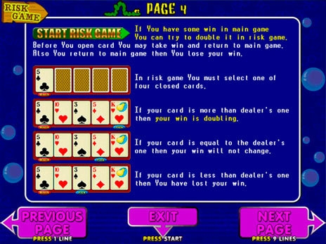 После получения выигрыша от удачного вращения игрок может увеличить размер выигрыша в 2 раза. Суть рискованного раунда простая: клиент выбирает 1 карту из 4 в надежде, что она окажется выше, чем у дилера. Сложность состоит в том, что карты закрытые. Выигрыш зависит от интуиции клиента казино. В результате выигрыша пользователь награждается удвоением выплаты. Если карта клиента окажется ниже, чем у дилера, то заработная ставка проигрывается.