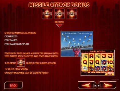 Суть тематической бонусной игры состоит в том, что игроку необходимо сбивать ракетные устройства. Взрывные приспособления летят на главного героя. Для выигрыша Железный человек, то есть, пользователь автомата, должен сбить как можно больше ракет. В случае удачного завершения бонусного тура клиента ожидает приятная награда. Пользователю предоставляются дополнительные бесплатные спины.