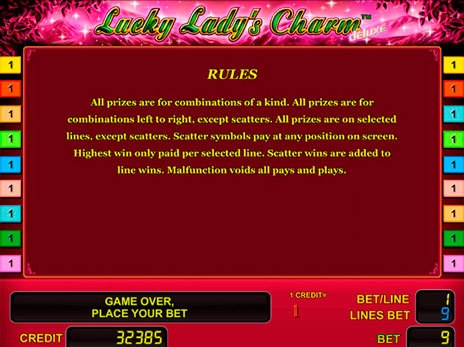 Видео слот Lucky Ladys Charm – отличная разработка компании Novomatic. Положительные отзывы постоянных клиентов лишь подтверждают качество игровой модели автоматов. В процесс игры можно задействовать 10 активных полос. Это отличает видео слот от таких автоматов, как King of cards, Fruit Cocktail , Garage , Crazy Monkey и др. Максимальная выплата составляет 9 000 бесплатных ставок. Такими щедрыми вознаграждениями не могут похвастаться такие автоматы, как La Fiesta, Wild West, Party Line и прочие.
