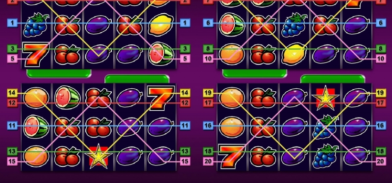 В игровом автомате Sizzling Hot Quattro для формирования оплачиваемых комбинаций можно задействовать одновременно 24 игровые линии. Это увеличивает шансы на прибыль и отличает игровой автомат от таких разработок, как Columbus, Bananas go Bahamas, Crazy Monkey. На экране есть 20 игровых барабанов. Их количество гораздо выше, чем в таких слотах, как King of cards, Crazy Monkey, Columbus Deluxe.