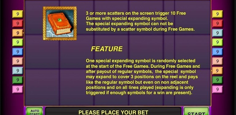 Специальными знаками Дикий и Разброс выступает изображение магической книги. Игровой элемент одновременно формирует наиболее высокооплачиваемые цепочки символов, и активирует призовой раунд бесплатных спинов. С помощью книги клиент получает шанс собирать комбинации, которые дарят щедрые денежные выплаты.